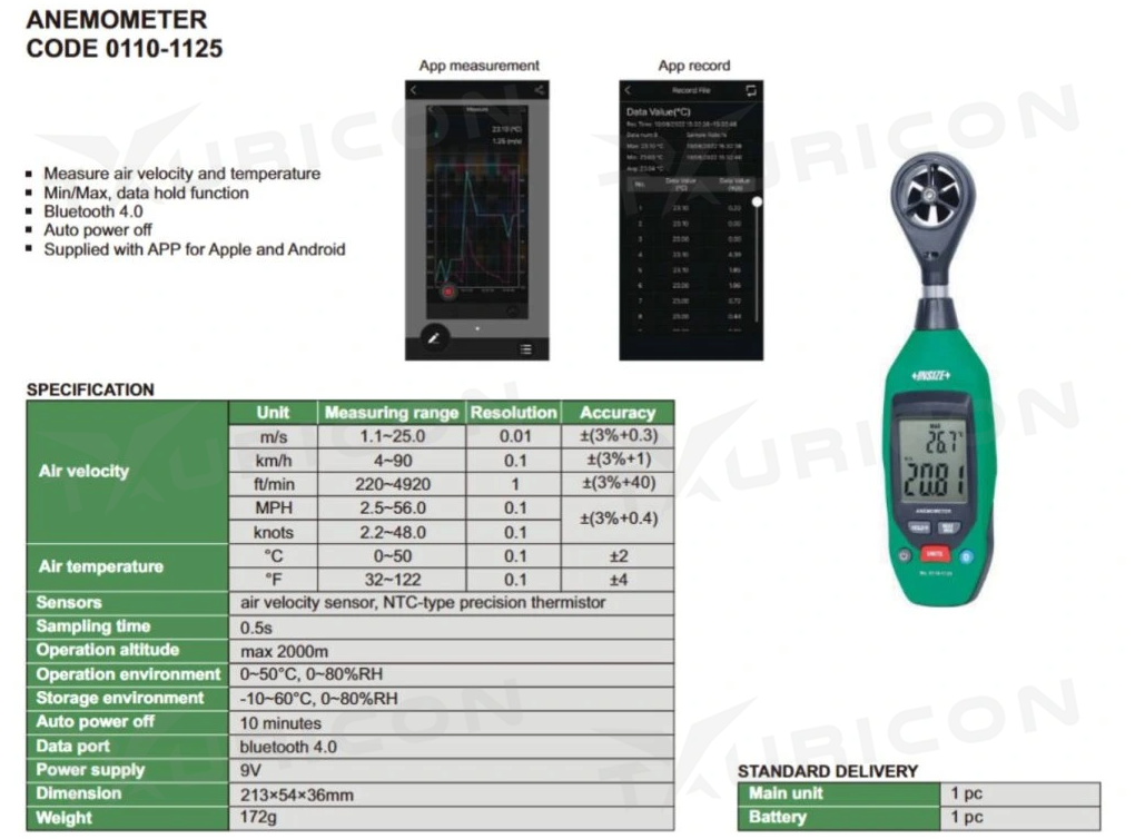 Anemometer 0110-1125 INSIZE meria rýchlosť, prúdenia, teplotu a vlhkosť prúdenia vzduchu.. Automatické vypínanie prístroja, USB.